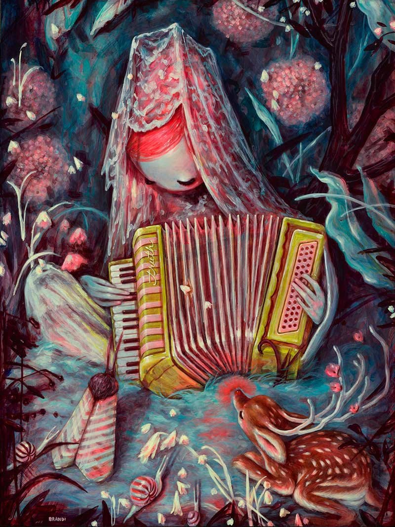 As a student, I referenced one artist in particular, Brandi Milne, a painter I consider a master of her craft. Milne works with a palette of soft pinks and vibrant reds, layered atop shadowy violets and deep teals. Her colors are that of a delectable peppermint candy, waiting for someone to pluck it from its crystal plate and pop it in their mouth. And in the same breath, of blood, sinking in the vast sea. Her palette is bittersweet. Her colors are intentional. And she is a master of storytelling through the paints she strokes onto a canvas.